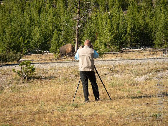 Bald schon, kurz hinter Madison treffen wir auf die erste Tiersichtung am rechten Straßenrand, halb noch im Wald und umgeben von grauem Nebel stehen eine handvoll Bisons, grasen und lassen sich nicht stören. Schnell haben sich hinter uns weitere Schaulustige angefunden, wo die so schnell immer herkommen, weiß ich nicht. Auch ein Ranger ist auf einmal aufgetaucht und paßt auf, dass niemand zu nahe an die Tiere herangeht.