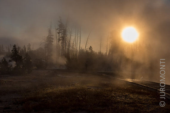 Inzwischen ist es 7:10 Uhr und man merkt, dass die Tagesdämmerung mit Macht den Rest der Nacht vertreibt und kurz vor dem Bisquit Basin ist es dann soweit, der neue Tag bricht an, die Sonne geht über dem Wald auf, und taucht den Himmel in einen warmen aprikotfarbenen Ton, bis sich das ganz normale blau, wie an jedem anderen Tag auch die Vorherrschaft nimmt.
