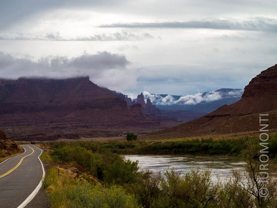 Nach dem Frühstück packen wir mal wieder alles ein und um, laden das Auto, tanken und fahren auf der I-70W bis zum Abzweig UT128 weil wir auf diesem „Umweg“ nach Moab fahren wollen. Wir hoffen in der Ferne auf besseres Wetter und wären wirklich schon froh, wenn es zu regnen aufhören würde.
