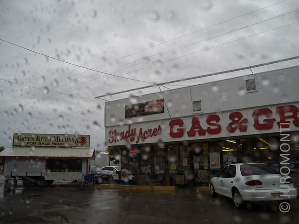 07:35 Uhr, 12°C in Green River: Regen, Regen, Regen – keine Rundumsicht – Berge alle in den Wolken – alles grau in grau, also können wir den Crystal Geyser heute auch vergessen....