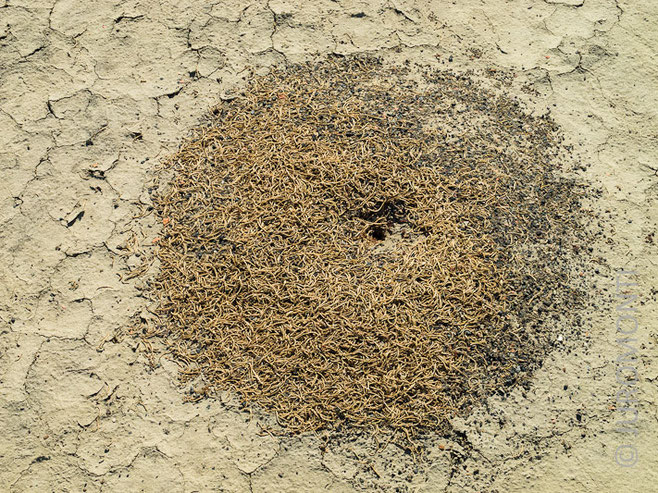 Ameisenhaufen im Großformat haben wir unterwegs auch gesehen, sie sind aus kleinem bunten Steingebröcksel gebaut und mit irgendeiner Art von Tannennadeln belegt. Nur, wir haben weder Tannennadeln, noch Nadelbäume gesehen.