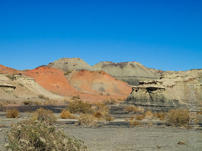 Links auf unserem Weg liegen etwas weiter entfernt organgerote Hügel, rechts Dunkelgraue bis Schwarze. Wir halten uns an den Verlauf des Alamowash und der Garmin zeigt uns artig die Richtung zu den Chocolate Hoodoos, die heute als Nummer 1 auf unserem Programm stehen. Sonnenuntergang ist um 17:45 Uhr, wir haben uns schlau gemacht, nur damit nix schiefgeht und wir früh genug wieder zum Parkplatz aufbrechen, BEVOR die Dämmerung einsetzt!