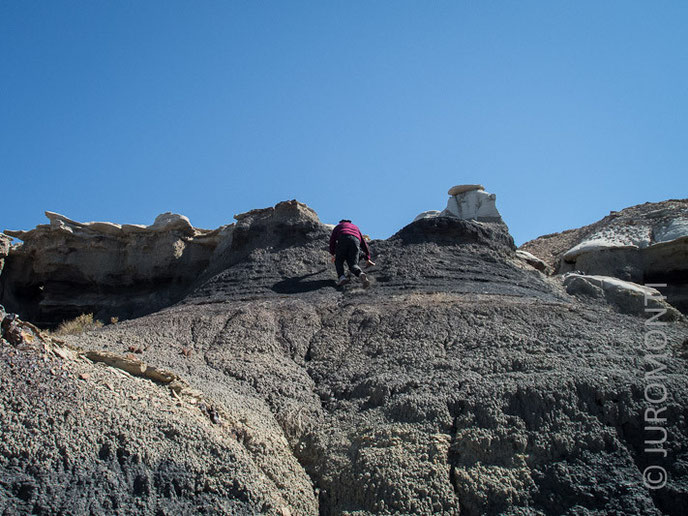 Bald (heißt wenn ich mitlaufe, nach knapp 1,5 Stunden) haben wir den Wegpunkt für die „Chocolates“ erreicht und stellen fest, wir müssen einen Weg oben auf die schwarzen Hügel finden, um mit den Hoodoos auf einer Höhe zu sein. Von hier unten sieht man sie nur teilweise. Ro baldowert eine Stecke aus, auf der ich auch fast nach oben komme, damit ich diese wundervollen Hoodoo-Helden auch sehen kann.