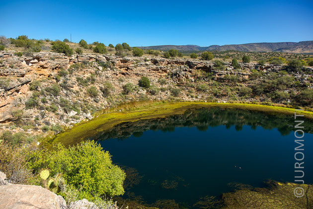 Dieser Montezuma Well bekommt im Durchschnitt durch Regen etwa man sagt weniger als 33 cm Wasser, damit kaum 1/3 des nationalen Durchschnitts der USA. Doch er enthält über 15 Millionen Gallonen / 56,8 mio Liter. Es ist ein Quellteich und wird durch Wasser aus einer unterirdischen Höhle gespeist. An den steilen Felswänden kann man noch Überreste alter Indianersiedlungen sehen, die einst mit Leitern von oben betreten wurden. Man sagt, die Kultur der Sinagua hatte um 1100 ihren Höhepunkt gehabt, als der Sunset-Vulkan ausgebrochen ist und die Böden mit Nährstoffen angereichert hat. Irgendwann ging die Fruchtbarkeit des Bodens zurück und die Sinagua verschwanden Anfang 1400.