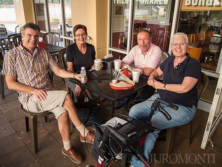 Reingekommen bei Fords Garage, ist unser erstes Ziel Starbucks, und natürlich wollen wir draußen sitzen und machen es uns unter dem Vordach mit unseren Kaffees, Frapuccinos und Chocolates sowie Sandwiches, Danish Cookies und Yoghurt bequem. Kurz drauf fängt es ganz dolle an zu regnen und wir rücken zusammen, damit wir nicht von dem hochspritzenden Wasser doch noch naß werden. Frieren tut keiner von uns, denn es ist nach wie vor sehr warm.