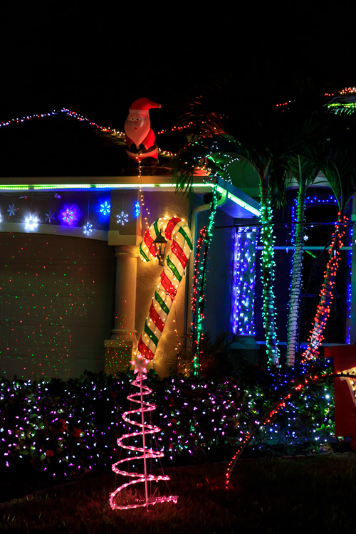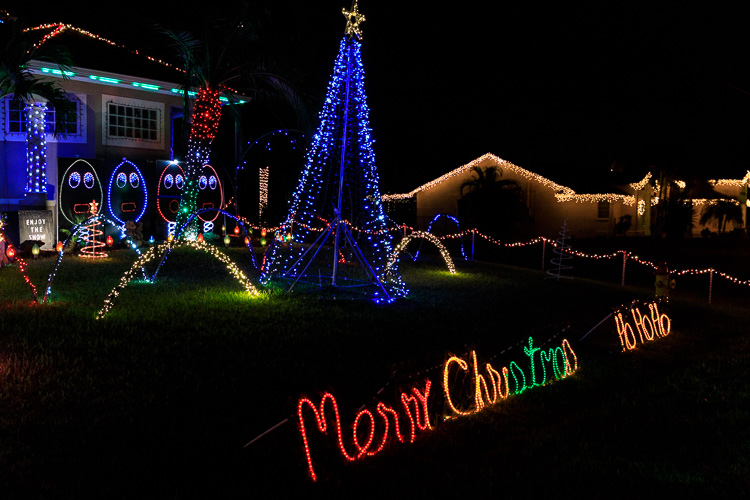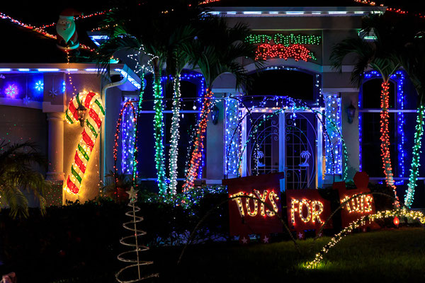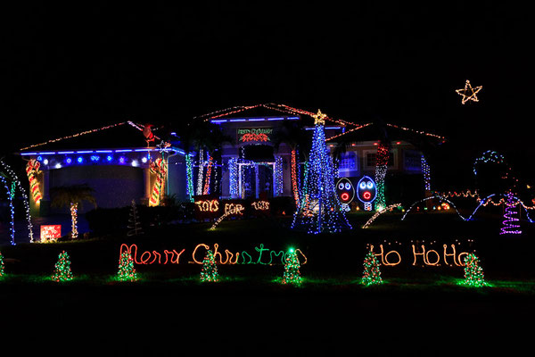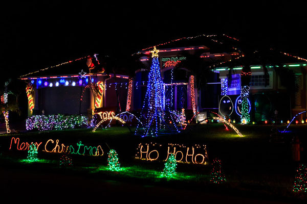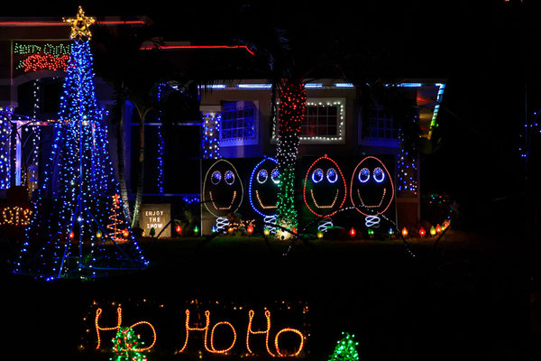 Mit einbrechender Dunkelheit kommen wir im Ferienhaus an, nehmen eine Dusche und ziehen schon wieder los, zu den weihnachtlich geschmückten Häusern in der Gegend.