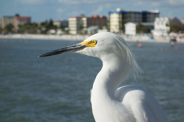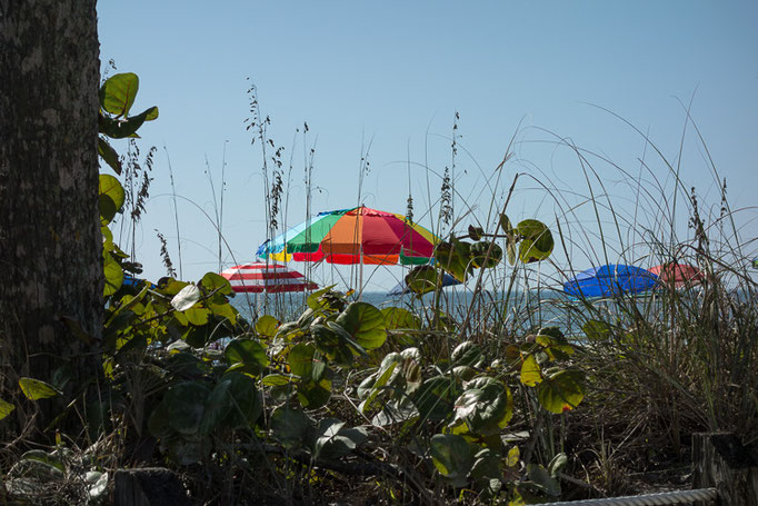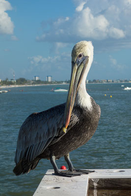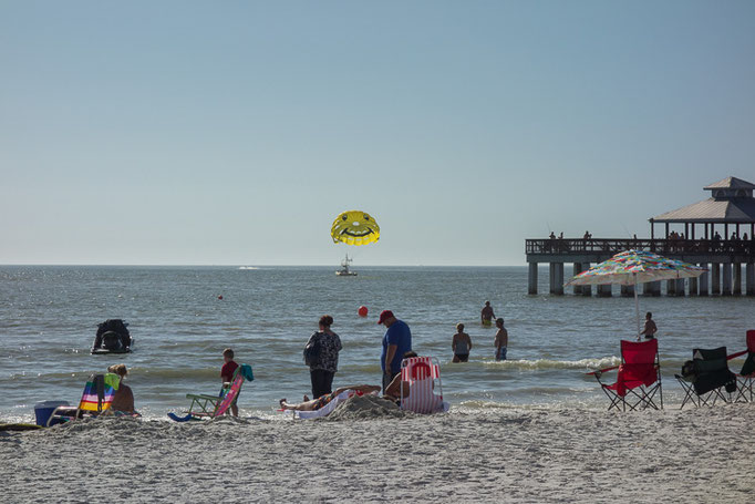 Die Strandstühle aus der Garage sowie der Sonnenschirm tun uns gute Dienste und so vertreiben wir uns ein wenig die Zeit mit umherlaufen, rumsitzen, lesen, Leute schauen und geschaut werden, die müssen alle schmunzeln über Lee..... Auf dem Pier sind wie immer ein paar Pelikane und auch white Herons unterwegs, die begierig um die Eimer der Fischer herumschwänzeln, anstatt nebendran in den Golf zu tauchen und sich das Frischfutter selbst zu besorgen.