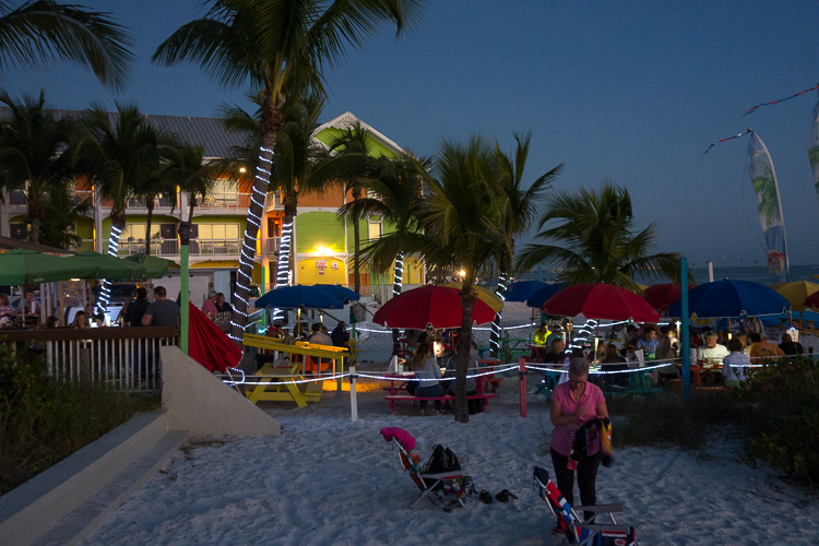 Gegen 23:15 Uhr suchen wir uns einen Platz am Strand und den finden wir genau vor einem Strandlokal mit fetziger Funky Music, das gefällt uns so richtig gut und außerdem ist es dort nicht so schrecklich dunkel, dass man seine eigenen Füße im Sand nicht mehr sieht., da die Beleuchtung bis zu unserem Standpunkt reicht.