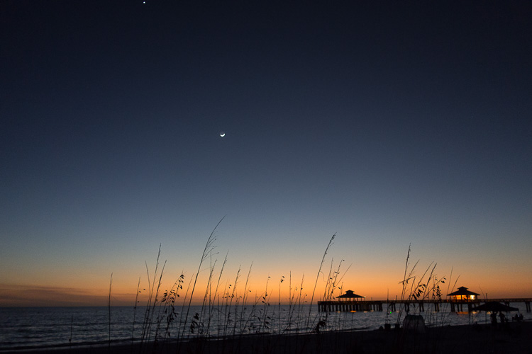 Der Mond ist inzwischen mit einer ganz zarten Sichel aufgegangen. Der Neumond von gestern ist vorbei und der Mond nimmt wieder langsam zu. Die Sichel liegt jedoch horizontal und nicht wie bei uns vertikal. Die Venus (wir nehmen an, sie ist es) steht brav östlich der Sonne und wird ihrem Ruf als Abendstern mehr als gerecht, sie leuchtet so hell und klar, bald heller wie der Mond. Irgendwann wird sie wieder Morgenstern sein, wenn sie die Erde „überholt" hat, da sie sich auf ihrer Bahn schneller als die Erde bewegt und dann westlich der Sonne morgens erscheint.
