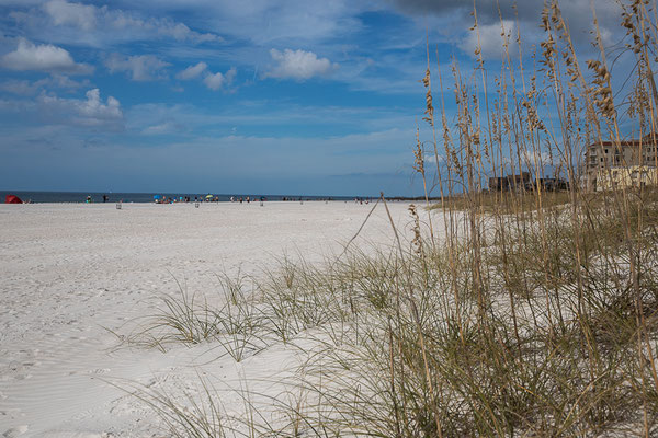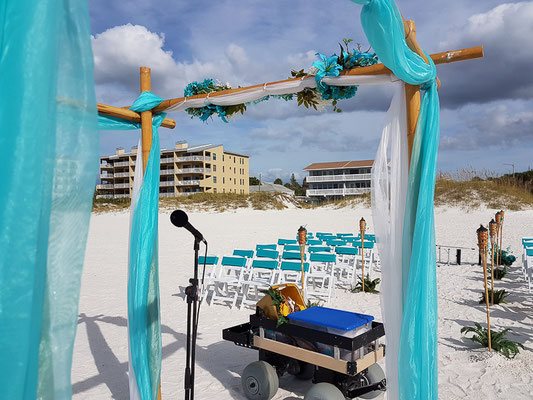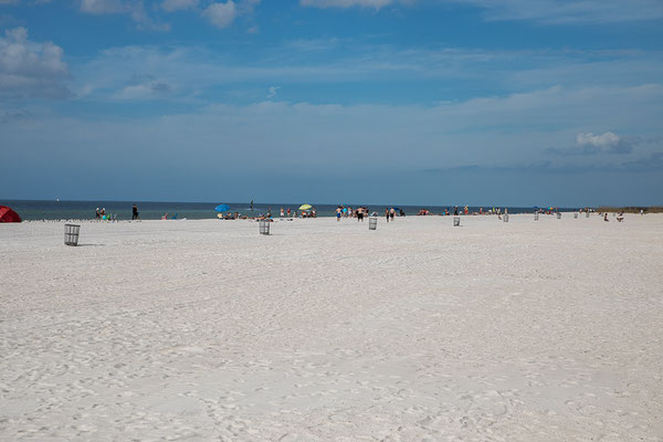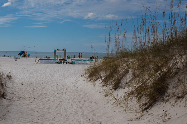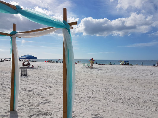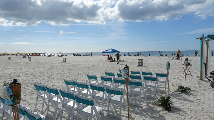 Der pulverige weiße Sandstrand von Clearwater Beach gehört zum Erbe Floridas. Es erscheint logisch, anzunehmen, dass die Küste aus fragmentierten Muscheln entstand. Tatsächlich kam der weiche, weiße Sandstrand von Clearwater Beach aus den Appalachen. Clearwater Beach-Sand besteht nicht aus Muscheln, sondern aus Quarz. Das ist für die brillante Farbe der Sandstrände der Golfküste verantwortlich. In längst vergangenen Zeiten trugen Flüsse den erodierten Stein der Appalachen nach Süden. Kein Wunder, dass hier auch gerne Hochzeiten am Strand ausgerichtet werden, aber die Zeremonie findet erst später statt und wir können nur den Aufbau bewundern.