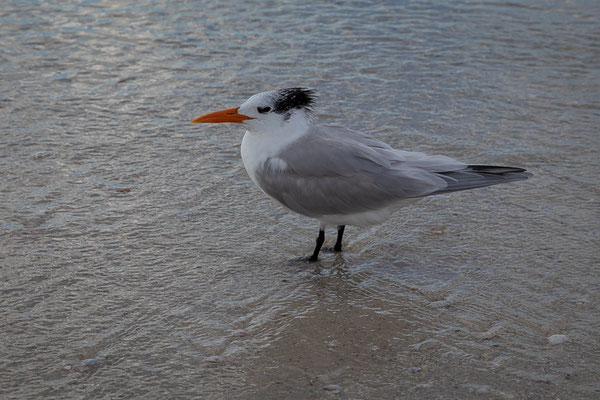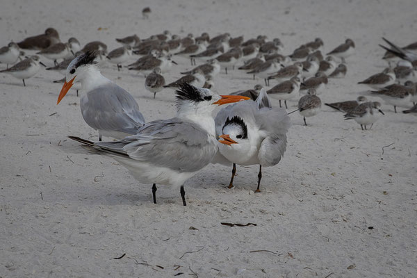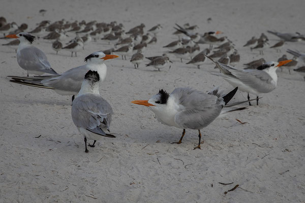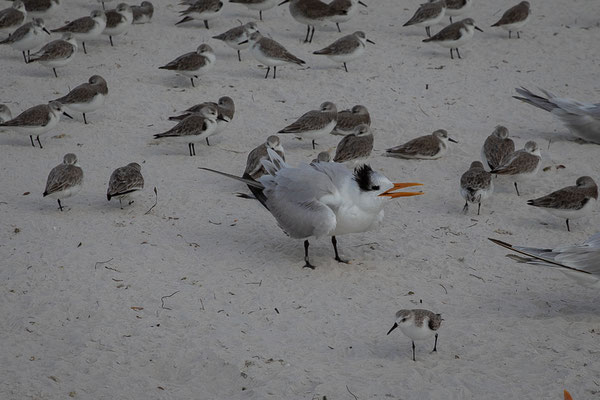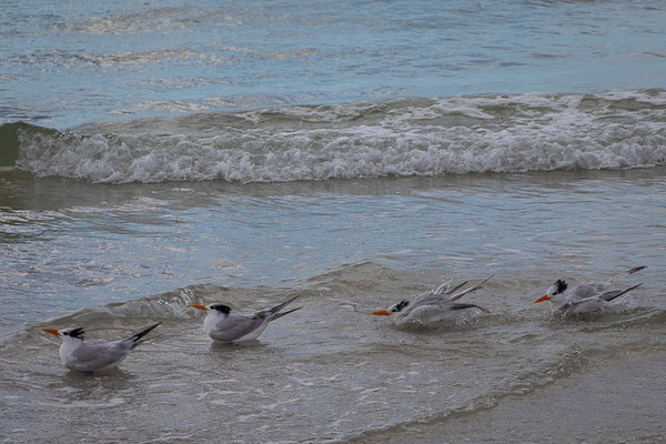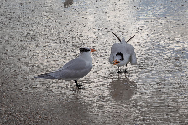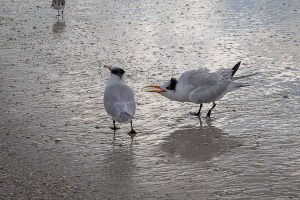 Jetzt fahren wir erst einmal nach Clearwater, um den heißgeliebten Strand unserer allerersten Floridareise wieder zu sehen. Der Sand ist immer noch ganz fein und weiß wie Schnee und die Möwen und Sandpiper schnabulieren die Köstlichkeiten die der Golf für sie anschwemmt. Dann sehen wir Königsseeschwalben bei der Balz, ach ein Geschrei und angehimmel und die Auserkorene dreht sich rum und geht ins Wasser, was soll denn er jetzt davon halten? Die Königsseeschwalbe (Royal Tern) hat eine Körperlänge von 42 bis 49 Zentimetern und im Brutkleid einen orangengelben Schnabel sowie eine deutlich ausgeprägte Haube. Im Ruhekleid hat sie eine weiße Stirn und der Schwanz ist immer tief gegabelt.