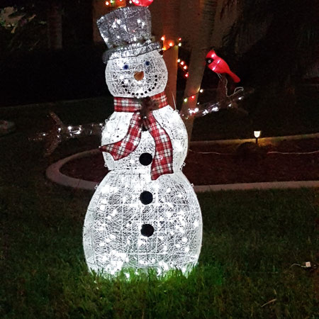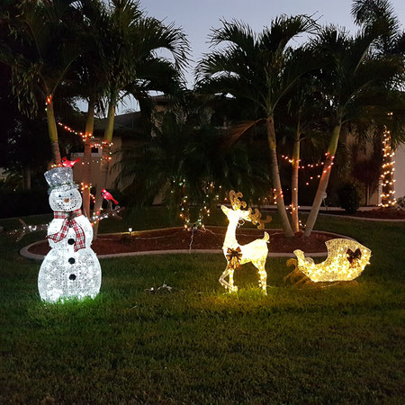 Im Nu waren wir dann vor unserem gemieteten zu Hause für die nächsten Tage. Im Vorgarten leuchtet Frosty mit Rudolf dem Rentier mit Schlitten um die Wette, und ein paar Sträucher sind auch mit Birnchen geschmückt.