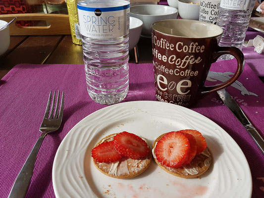Unser selbsgemachtes Abendessen besteht heute aus Lachs und Currygemüse mit Instantreis. Wir waren sehr zufrieden und computern jetzt noch ein wenig, bevor wir dann zu Bett gehen.
