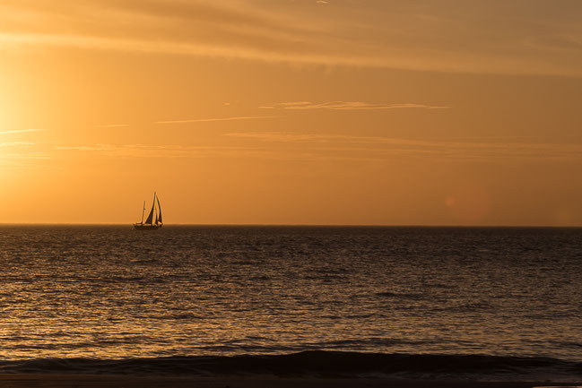 Kurz vor Sonnenuntergang ziehen ein paar Delphine vorbei und ein Schiff kreuzt am golden beleuchteten Horizont im Gegenlicht. Mit dieser fast kitschig angehauchten Komposition der Natur, verbreitet sich ganz leise und heimlich, eine besondere, friedliche, ganz wundervolle Stimmung. Eigentlich möchte man hierbleiben und schauen und schauen und schauen.....