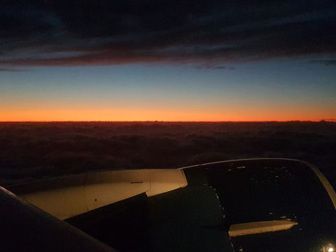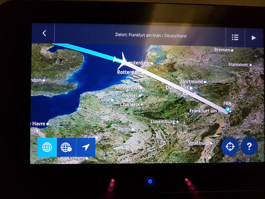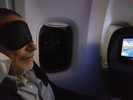 Also dann fliegen wir mal und fliegen und fliegen und schauen mal aus dem Fenster wo uns die Dunkelheit umgibt. Das monotone dröhnen der Motoren lullt einen so richtig ein. Wir schauen ein wenig im Filmprogramm, mal dies und das und dann gibts ein Abendessen und anschließend eine Mütze voll Schlaf….