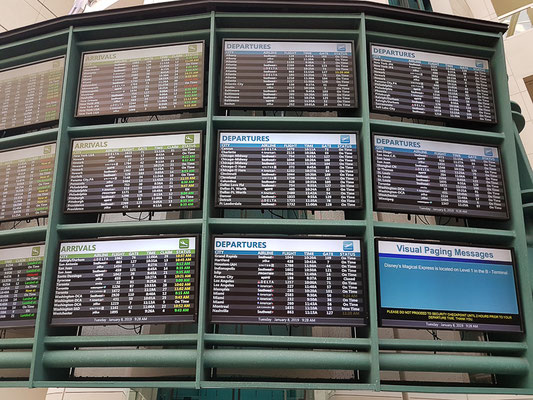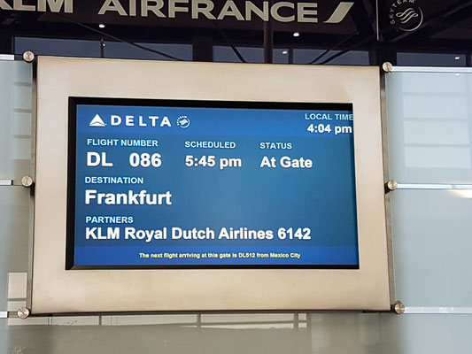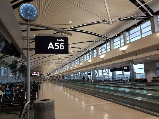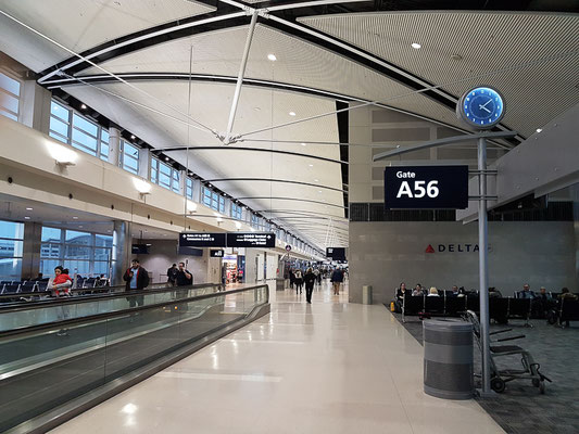 Dank dem TSA Pre-check Vermerk auf unserem Ticket darf die Kamera und der PC eingepackt bleiben, die Jacke und Handgepäck kommt in den entsprechenden Behälter und fährt durch den Röntgentunnel fürs Gepäck. Wir gehen durch den Körperscanner und dann weiter zu unserem Gate 78, 11:35 Uhr – unser Flug nach Detroit ist pünktlich, das hatten wir vorher schon auf den Anzeigetafeln nachgeschaut.