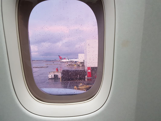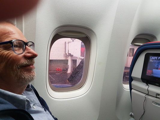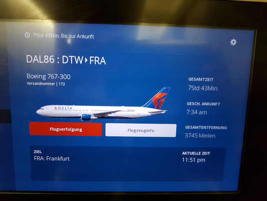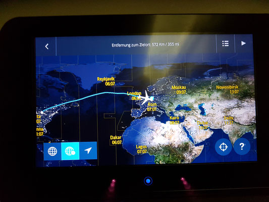 Um 17:15 Uhr Ortszeit haben wir Dank Economy Plus Buchung, bereits unsere Plätze in der Boeing 767 für die nächsten knapp 8 Stunden eingenommen und richten uns häuslich ein. In Deutschland ist es jetzt 13:51 Uhr und wir werden voraussichtlich morgen früh gegen halb acht in FRA landen.