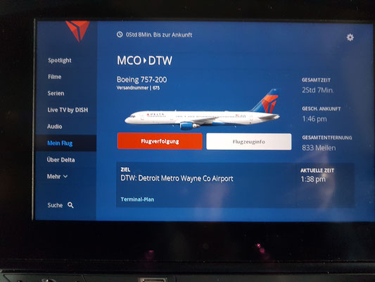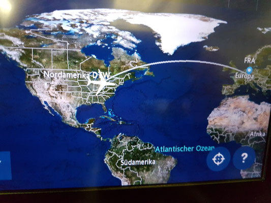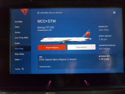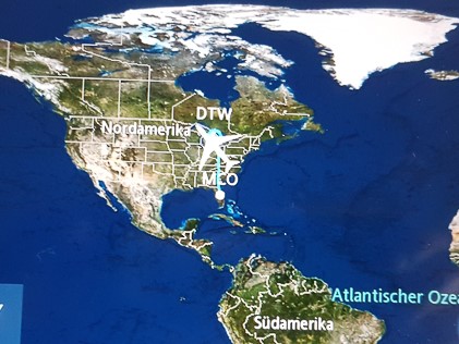 Die 833 Meilen von Orlando nach Detroit legen wir in zwei Stunden in einer Boeing 757 zurück. Der Flug war angenehm, trotzdem fühlen wir uns irgendwie müde und entschließen uns nach unserer Ankunft um 13:46 Uhr Ortszeit, zu einem kleinen Snack, denn bis zum Weiterflug dauert es noch bis 17:45 Uhr. Das Gepäck ist bis nach Deutschland durchgechecked und wir brauchen es nicht vom Gepäckband zu holen und wieder aufzugeben, daher können wir hier noch gemütlich etwas essen und trinken, bevor wir dieses Mal zu unserem Gate A 56 gehen. Aber jetzt wird die Zeit doch lang, man geht mal ein paar Schritte nach hier und nach dort oder mal wieder ganz nach vorne, wo evtl. das Internet geht…. Dann macht man wieder ein paar Fotos und wartet, dass das Bording beginnt.