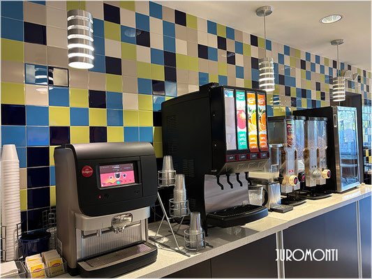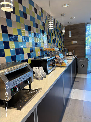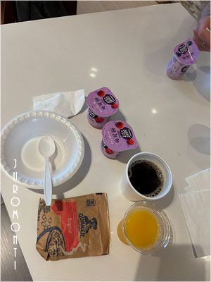 Die richtig gut funktionierende Dusche erfrischt herrlich, frische Klamotten auch und dann sind wir gegen halb 08.00 Uhr beim Frühstück. Ein schöner heller, großer Raum, nur wenige Plätze sind besetzt. Die Theke lässt keine Wünsche offen und wir bedienen uns mit dem, was wir mögen.