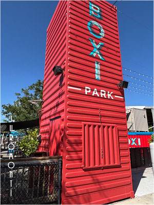 Wir erkunden die Gegend und der Boxi Park mit seinem roten Turm weckt unser Interesse. Der Park wird als einzigartiger Open-Air-Containerpark beschrieben, der für jeden etwas zu bieten hat. Gourmet-Schnellrestaurants, preisgekröntes Bier, Live-Unterhaltung und mehr. Aber alle Tore waren geschlossen.