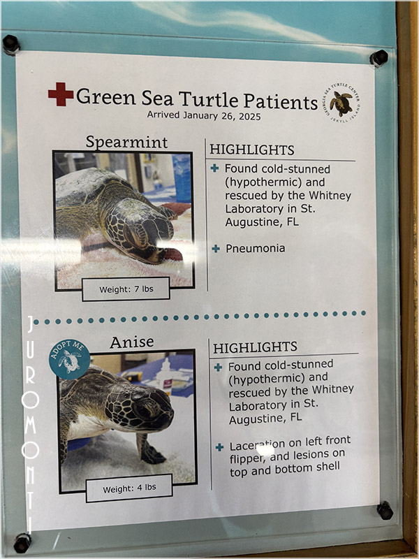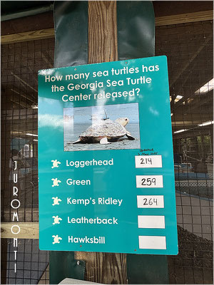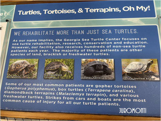 Aber jetzt geht’s weiter zum Georgia Sea Turtle Center, ebenfalls noch auf Jekyll Island. Das ist eine 2007 gegründete Rehabilitations- Forschungs- und Bildungseinrichtung. Das gibt der Öffentlichkeit die Möglichkeit etwas über Meeresschildkröten zu lernen und Reha-Maßnahmen in Aktion zu sehen. Eine Ausstellung zeigt, was den Tieren alles schon zum Verhängnis geworden wäre, wenn sie nicht vorher hierher gebracht und gerettet werden konnten. Schlimm!