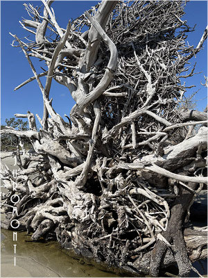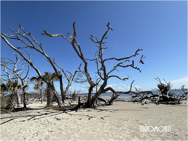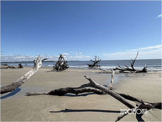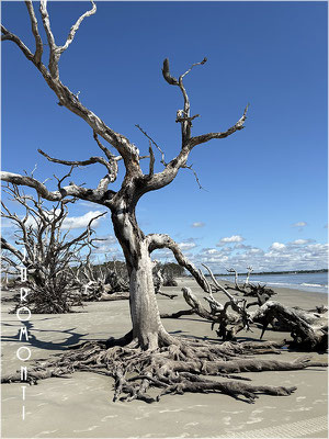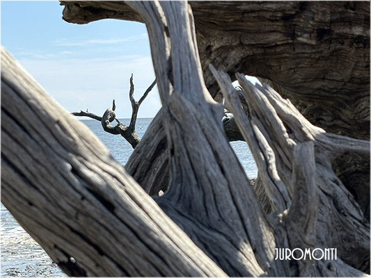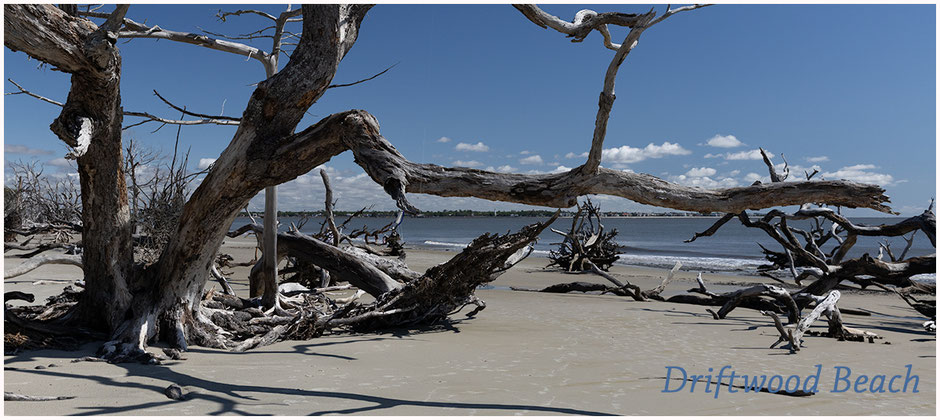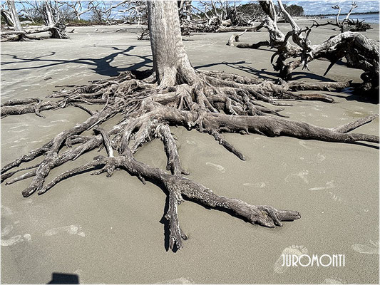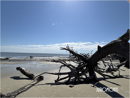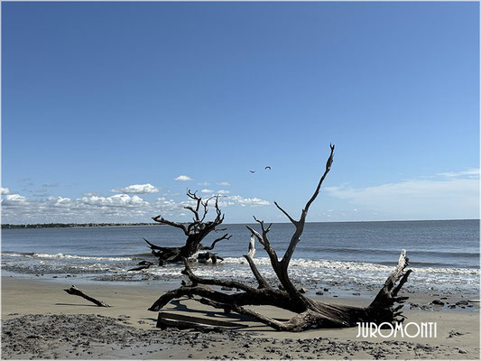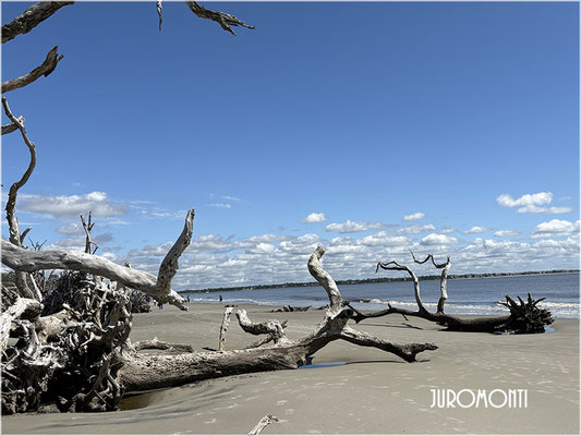 Nach einer guten Dreiviertelstunde erreichen wir Jekyll Island / Driftwood Beach und sind überwältigt von diesen stummen Treibholz-Denkmälern, die sich riesengroß, wie aus einer anderen Welt präsentieren. Ein Erkundungs-/Strandspaziergang zwischen diesen Riesen aus der Vergangenheit, ist traumhaft. Man sollte jedoch die Gezeiten beachten, damit man um diese grauen, von Wind, Sand und Wetter glatt geschliffenen Eminenzen herumwandern kann. Wir hatten Glück, konnten aber auf dem Rückweg sehen, wie das Wasser zurückkommt. Ein Ranger fährt mit einem kleinen traktorähnlichen Gefährt immer am Strand entlang, aber ich glaube man sollte sich deshalb nicht unbedingt in Sicherheit wiegen.
