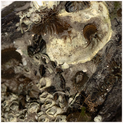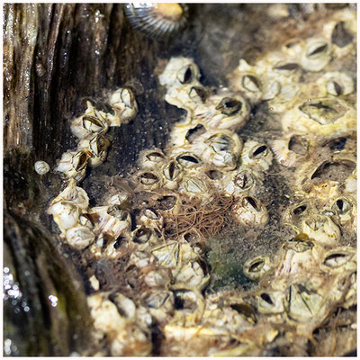 Diese Barnacles (Rankenflußkrebse) sitzen in den "ovalen" Löchern