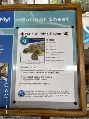 Kring Rowan hatte mehrere Verletzungen - "Barnacles" sind Rankenflußkrebse, die wir auch in den Aushöhlungen der Driftwoods gesehen haben, diese hatten wohl seinen Panzer besiedelt. Fibropapilloma ist eine durch einen Herpesvirus verursachte Tumorerkrankung, die Meeresschildkröten betrifft..... uhhhh - irgendwie mag man da gar nicht mehr ins Meer gehen.