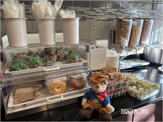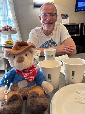 Cody bewacht noch ein wenig das gut eingepackte Frühstück bis wir unseren Kaffee und O-Saft ausgetrunken haben und freut sich auf die Weiterfahrt.....