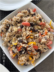 Hühnerfleisch- und Reissalat mit roten Bohnen zu.