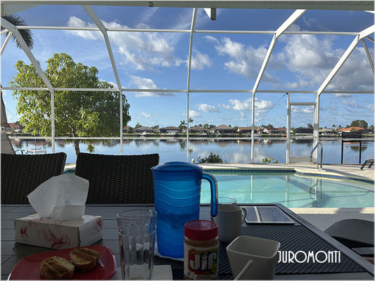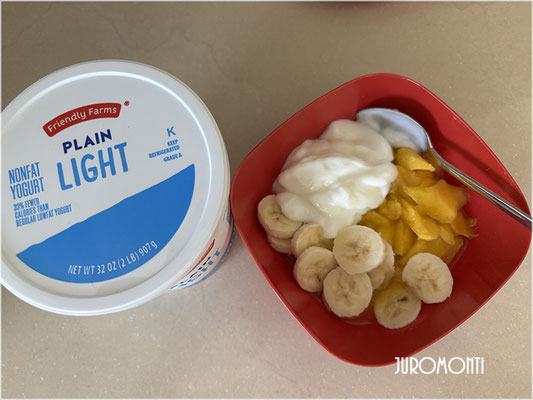 Herrliches Wetter beim Frühstück, aber in unserem Kühlschrank gibt nicht mehr die ganz große Auswahl. Wir müssen unbedingt einkaufen gehen, denn uns fehlt noch ein bißchen Joghurt, Mango und vor allen Dingen Papaya für unser Frühstücksbuffet in den nächsten Tagen. Hier gibt es ganz viele Sorten von Joghurt aber wir haben unsere Vorliebe für die Sorte “Plain” (schlicht, einfach) entdeckt. Den gibt es auch als griechische Variante ebenfalls mit 0% Fett und ohne Zucker. Natürlich kann man auch Joghurt mit 10% Fett kaufen. Entweder 10%, 5% - oder 0% so schwierig ist die Entscheidung nicht, denn sie schmecken alle sehr gut. Heute essen wir zusätzlich einen Bagel mit Erdnußbutter, weil das einfach hierher gehört und wir es zu Hause nicht essen.