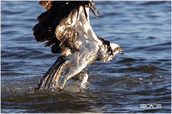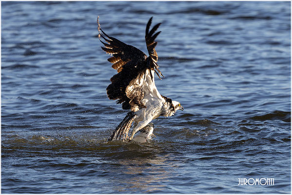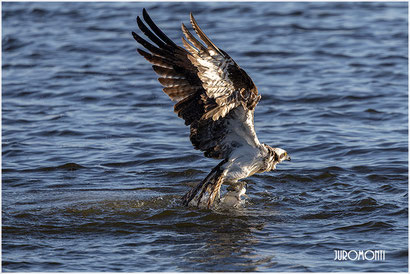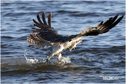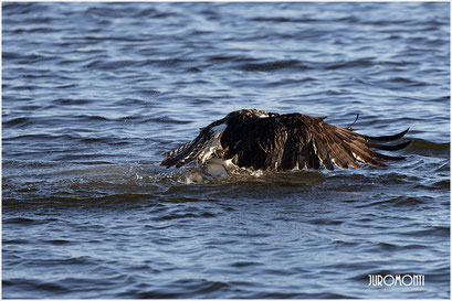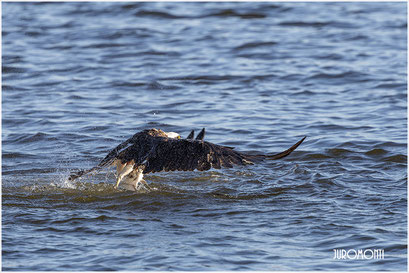 Dann plötzlich schießt er nach unten und er scheint etwas Mühe zu haben wieder aus dem Wasser aufzusteigen. Wir sehen auch gleich warum.