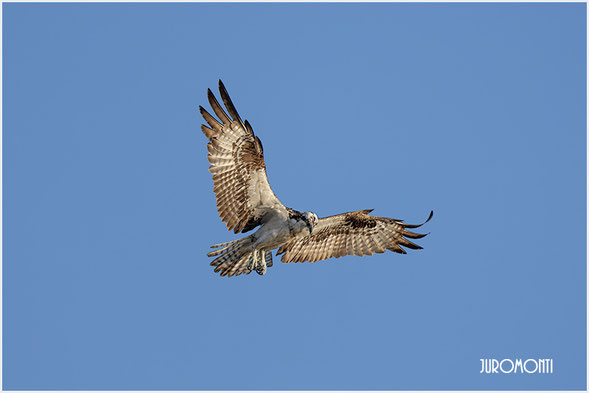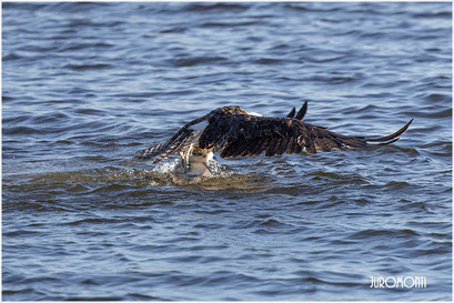 Drei oder vier Auspreys (Fischadler), kreisen über dem See, und wenn die hier sind, gibt es auch genügend Fischkrähen die den Fischadlern das Leben schwer machen und versuchen ihnen ihren Fang abspenstig zu machen.