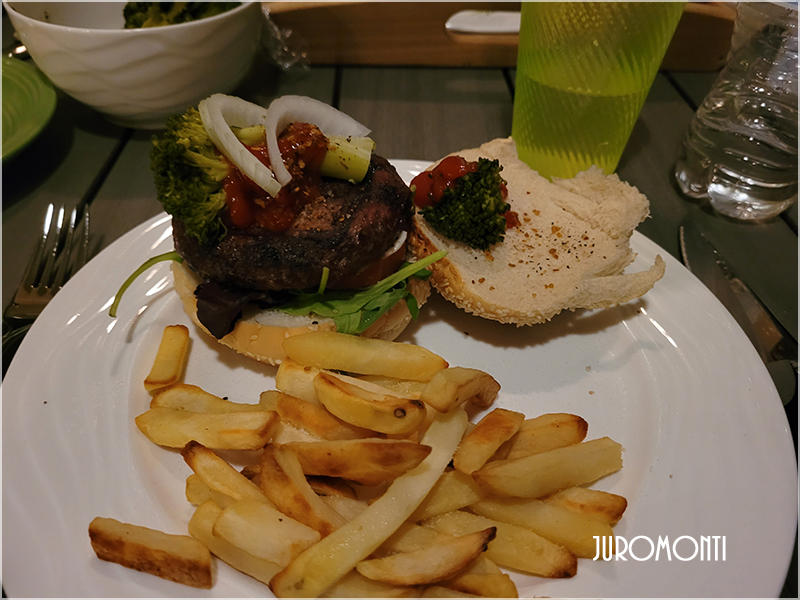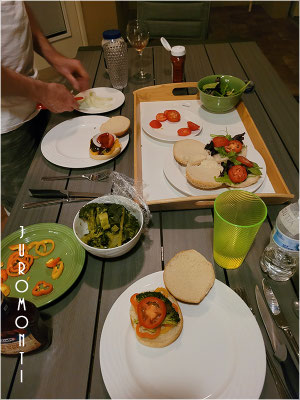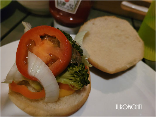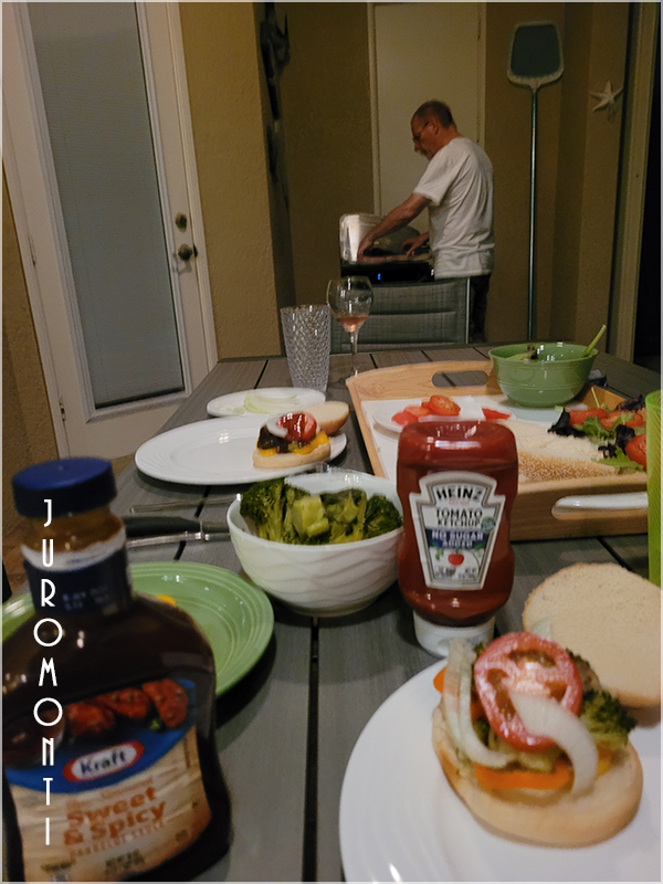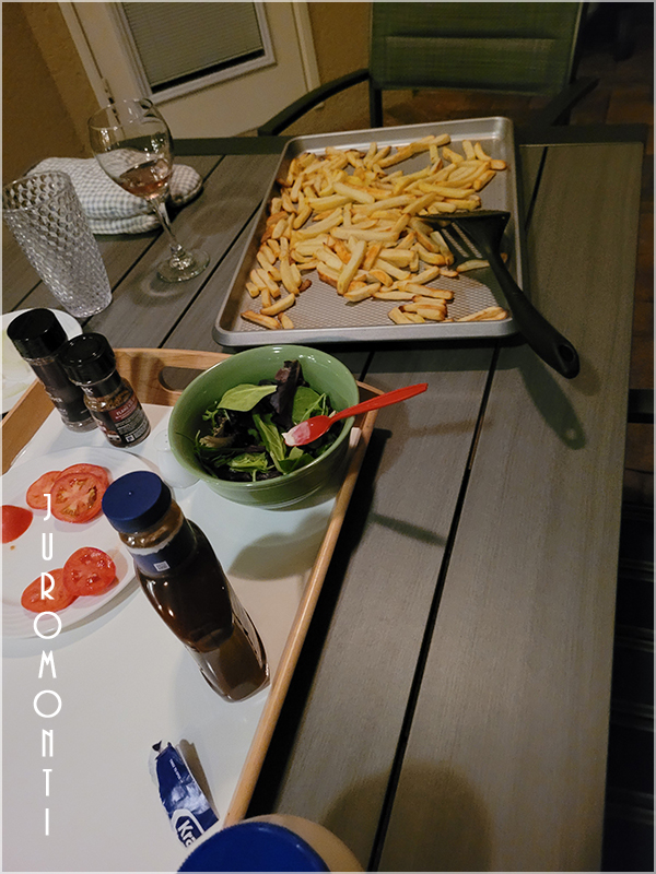 Mein persönlicher Lieblingsgriller bereitet erst einmal 2 Veggiburger zu und anschließend 2 Angusrind-Burger. Hhhhhmmmm, noch nie haben die so gut geschmeckt, wie heute in der abendlichen Poolarea, aber wir haben es kaum “geschafft” denn wir hatten auch noch Pommes, die wir auf dem Blech im Backofen bei 425°F knusprig gebacken haben.