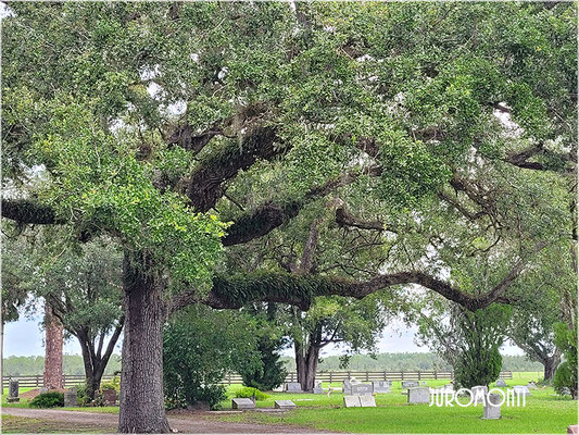 Der Hauptweg und große Teile des Friedhofs werden von riesigen alten Eichen und andern Bäumen beschattet. Außerhalb des Maschendrahtzauns grasen Rinder. Ein ganz ungewöhnliches Bild. Das Gras auf der Weide ist viel grüner, obwohl dort kein Schatten ist.