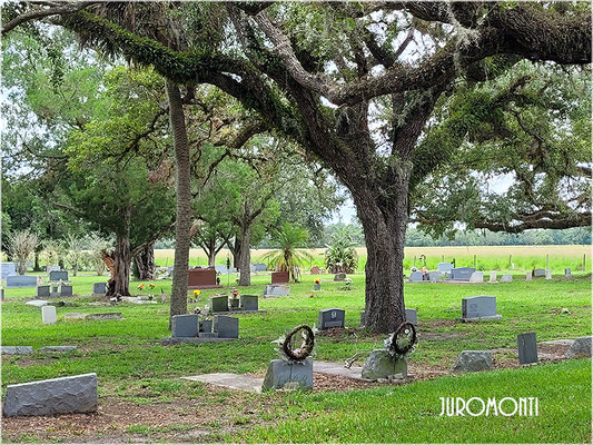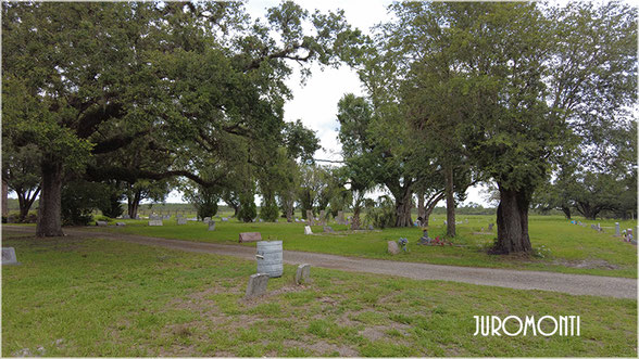 Die Straße ist jedoch asphaltiert und wird von riesigen alten Eichen gesäumt, also ist man nicht so weit von der Zivilisation entfernt. Sobald der Asphalt endet, und man durch einen Orangenhain (den ich nicht als solchen wahrgenommen habe) gefahren ist, sieht man rechts den eingezäunten Friedhof liegen.
