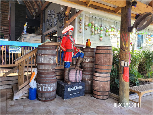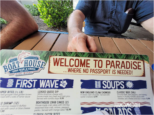 Das Auto kann man auf einem großen Parkplatz parken. Nicht weit vom Eingang werden wir fündig, gehen an der Tiki Bar vorbei und nehmen draußen unter einem Sonnenschirm Platz.