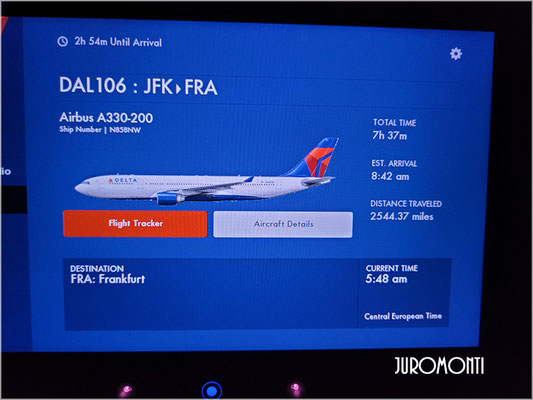 Es ist 19.05 Uhr (Ortszeit) und wir heben ab, ziehen noch eine Schleife und begeben uns auf die langen sieben Stunden und ca. 40 Minuten Flug nach Frankfurt. Nach knapp 5 Stunden sind wir kurz vor Irland und haben den Atlantik hinter uns gelassen, aber bis nach Frankfurt sind es immer noch 2:54 Stunden.